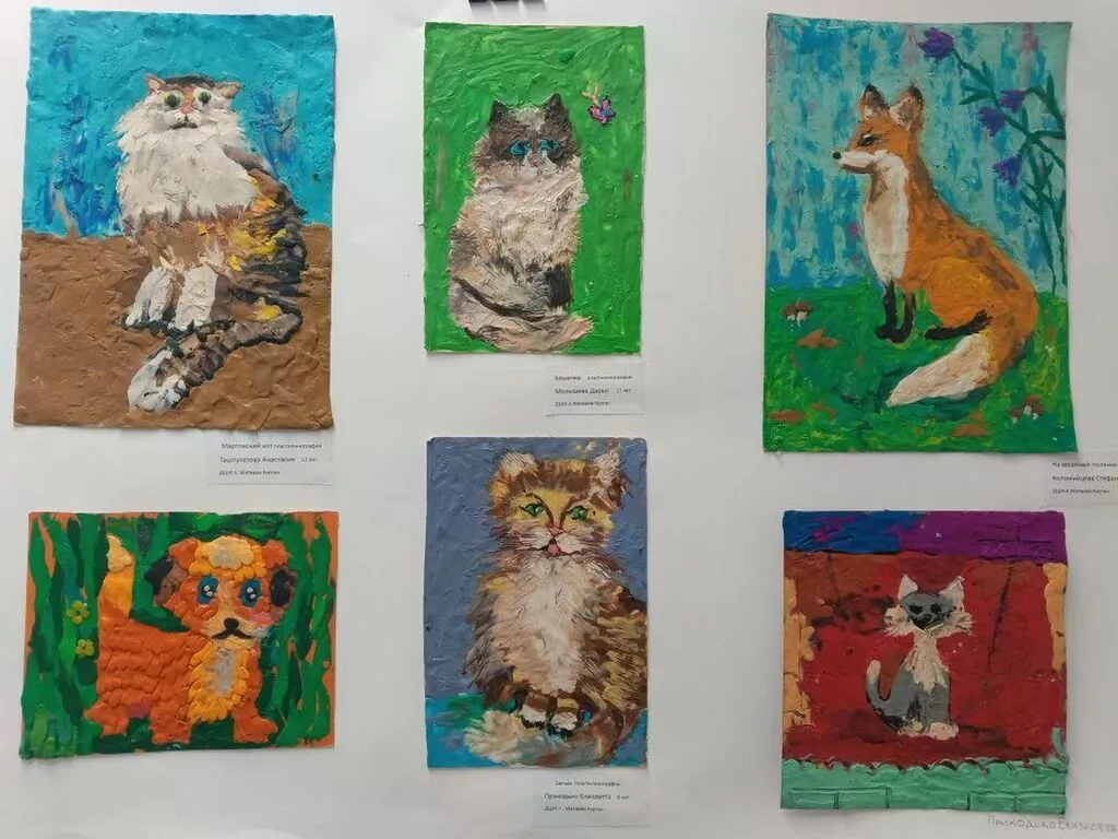 Работы, выполненные из пластилина, отличаются особой фактурой и объёмностью. На них также изображены домашние животные в весеннем антураже.